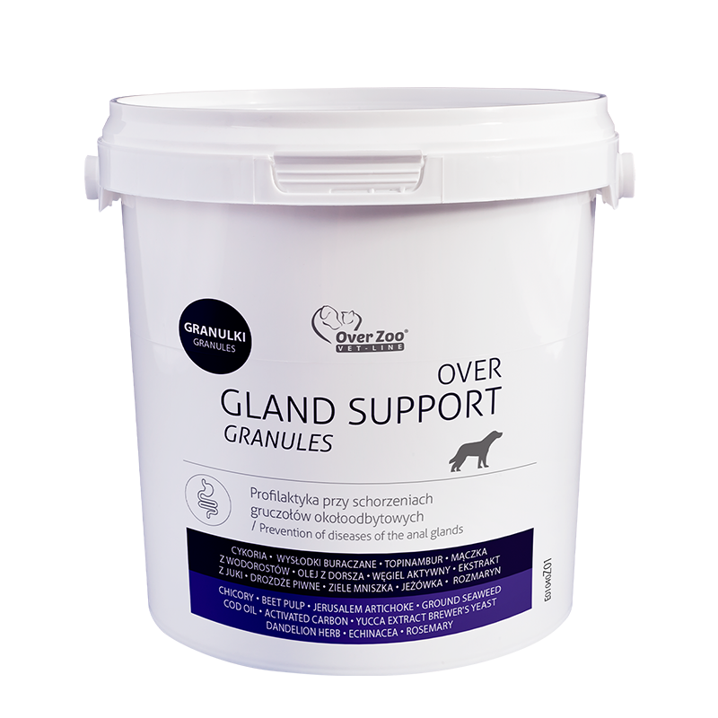 OVER Gland Support granules dzięki specjalnie opracowanej recepturze wspiera prawidłowe funkcjonowanie gruczołów okołoodbytowych. Zawarte w produkcie składniki regulują proces trawienia oraz fermentacji w przewodzie pokarmowym, wspierają usuwanie toksyn z organizmu, regulują konsystencję kału, działają przeciwzapalnie i antyoksydacyjnie. Produkt przyczynia się także do ogólnej poprawy funkcjonowania przewodu pokarmowego oraz zdrowotności psów.