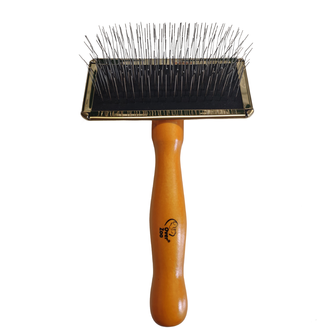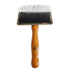 Najważniejszym elementem szczotki są długie, stalowe, lekko wygięte igły ze stali nierdzewnej, które ułatwiają pracę na głębszych warstwach sierści i pomagają rozczesywać bardziej wymagającą okrywę włosową. Gumowa poduszka amortyzuje nacisk i sprawia, że szczotka lepiej dopasowuje się do ciała zwierzęcia podczas pielęgnacji. Całość uzupełnia drewniany uchwyt o ergonomicznym kształcie, który dobrze leży w dłoni i ułatwia pewne prowadzenie szczotki.